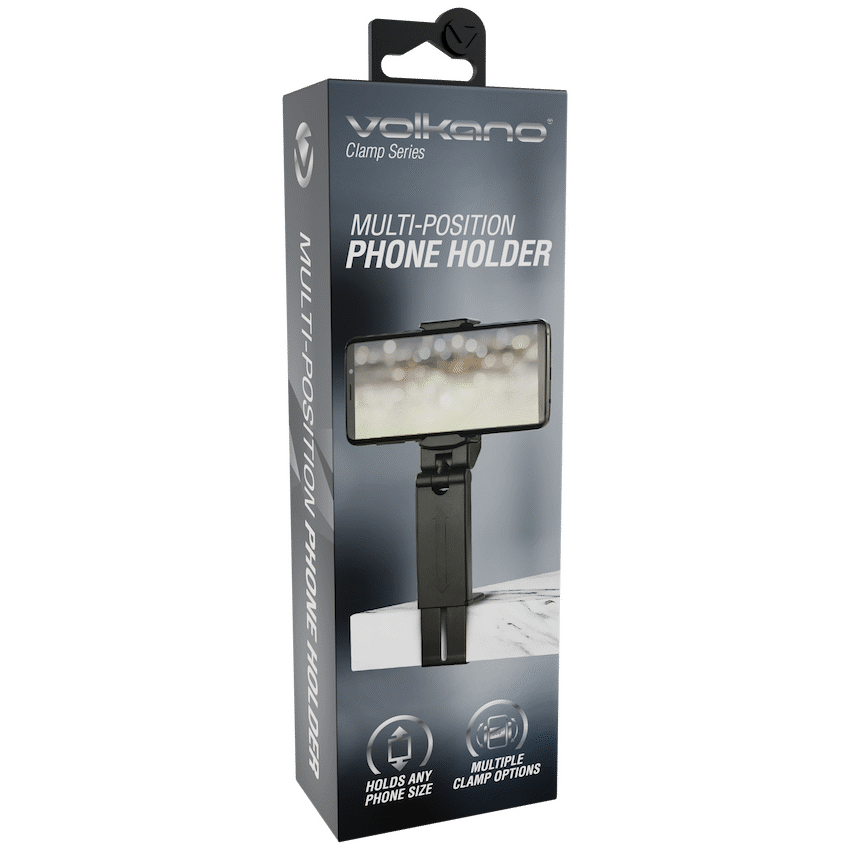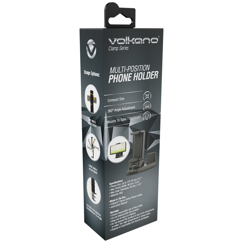 - This Volkano Clamp Series Phone Holder features a sturdy desk clamp, allowing for stable attachment to tables or shelves.