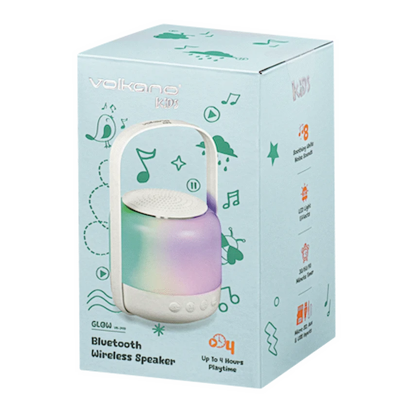 This Volkano Kids Glow Series speaker provides entertainment with music playback and a colourful light display. It functions as a portable audio speaker, weighing 390 grams, and creates a fun glow effect. This item is from the Volkano Kids Glow Series.