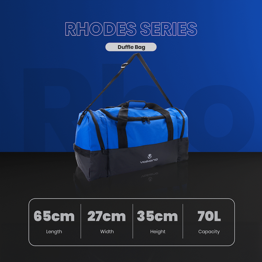 The Volkano Rhodes 70L Duffle in blue offers ample space for travel or gym essentials. Its 70-litre capacity holds clothing and gear. Made from durable materials with reinforced stitching, it handles regular use. This Volkano duffle is a practical choice for many needs.