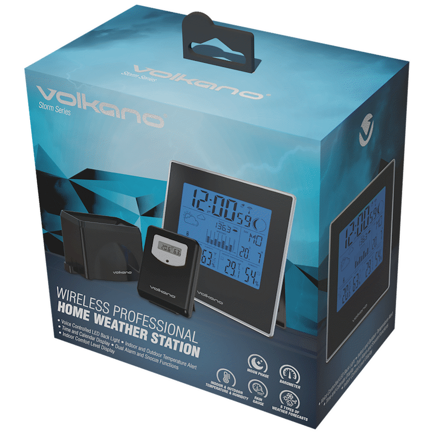 Get daily weather information for your office or home with the Volkano Storm series Weather Station. It displays local temperature and humidity readings, and includes a digital clock. This modern black unit is a practical addition from Volkano.