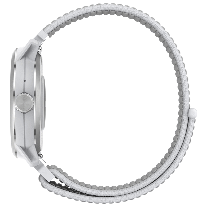 • The watch body is finished in light silver, paired with a durable nylon waterproof strap.