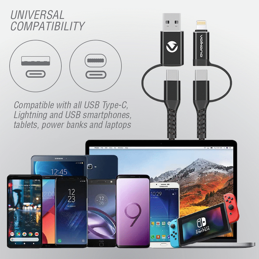 Get versatile charging for many devices with this Volkano Weave Series 4-in-1 Cable Two Pack. It includes 1.2 metre and 1.8 metre cables, offering USB-A or Type-C inputs to Type-C, Micro USB, and Lightning outputs. The Weave series provides lasting use.