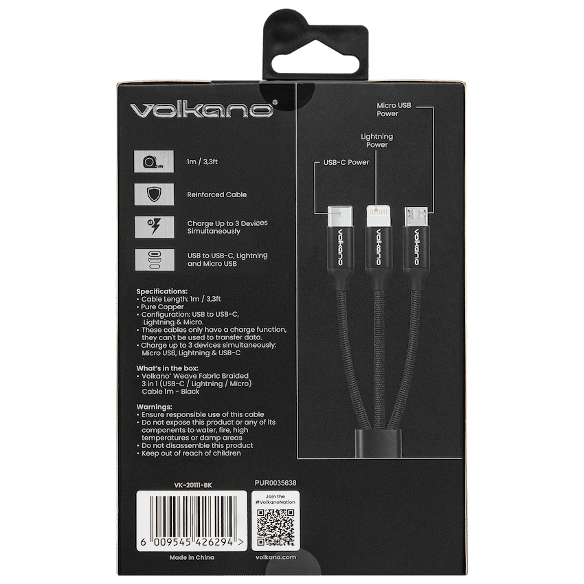 Charge multiple devices easily with the Volkano Weave Series Fabric Braided 3-in-1 Cable. This 1-metre cable has a durable fabric braided design and offers Micro, Type-C, and Lightning connectors for convenient use.