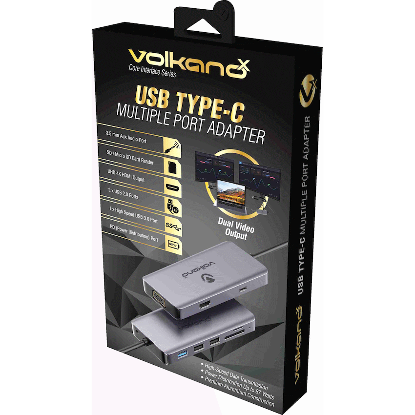 Improve device connectivity with the VolkanoX Core Interface Series USB Type-C hub. It features HDMI and VGA outputs, three USB ports, a card reader, and an audio jack. Power Delivery also charges connected devices. This is a practical VolkanoX product.