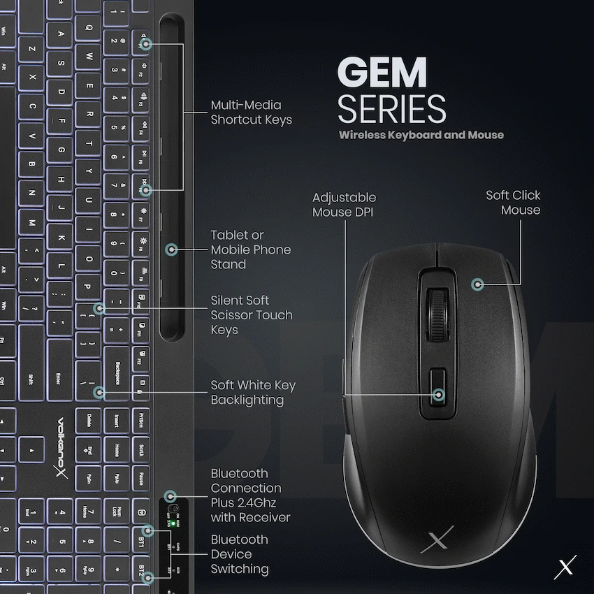 Improve workspace comfort with the VolkanoX Gem Bluetooth Wireless Keyboard and Mouse combo. It offers multimode connectivity via Bluetooth and 2.4 GHz, plus a backlit keyboard for low-light use. This black set is a practical VolkanoX choice.