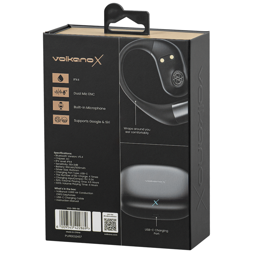 Stay aware while listening with VolkanoX O300 Air Conduction OWS Earphones. These open-ear Bluetooth earphones provide comfortable audio without blocking your surroundings. Enjoy up to 22 hours of playtime and IPX4 water resistance, reflecting VolkanoX quality.