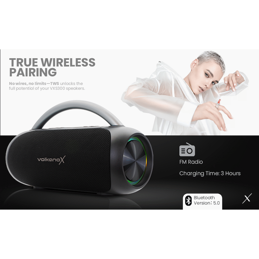 Enjoy clear, portable sound anywhere with the VolkanoX VXS300 Bluetooth speaker. It uses Bluetooth 5.0 for stable connections and offers IPX5 water resistance. This makes it suitable for indoor and outdoor listening, reflecting VolkanoX’s focus on dependable audio.