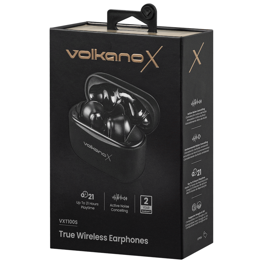 These VolkanoX VXT100S TWS Earphones block distractions for clear audio and calls. They feature Active Noise Cancellation (ANC) and Environmental Noise Cancellation (ENC) with four microphones. Enjoy up to 21 hours of total playtime. This is a dependable VolkanoX audio product.