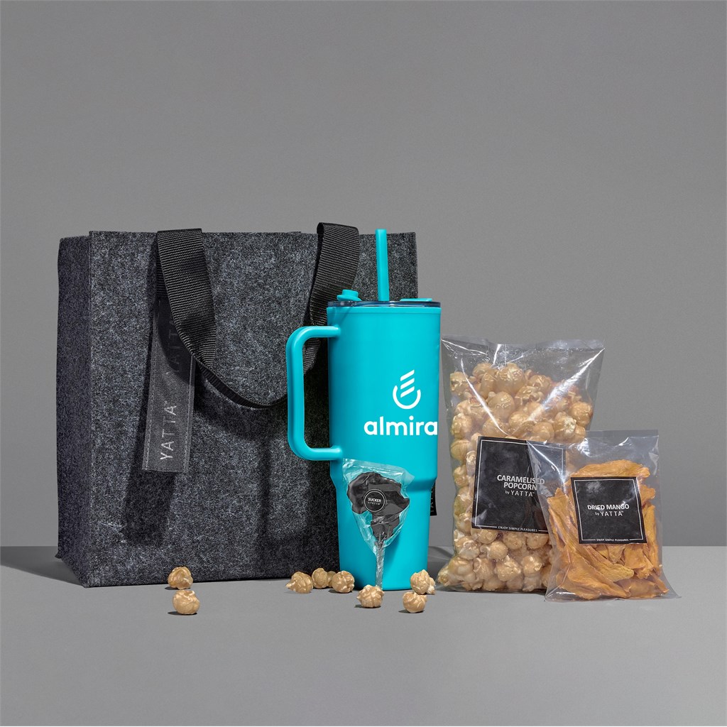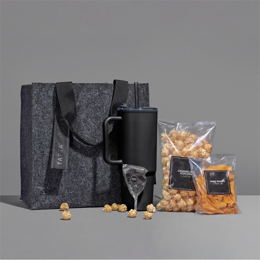 Show appreciation with the Yatta Classy Keepsake Hamper. This collection includes an Altitude 1.2L double-wall mug, Yatta African Sucker, dried mango, and caramel popcorn. All items arrive in a Dark Grey RPET felt gift bag, making it a thoughtful Yatta branded gift.