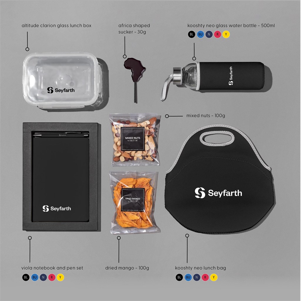 The Yatta Funky Fusion Hamper makes a practical promotional gift for staff or clients. It arrives in a grey gift box, 29x27x13cm, tied with a YATTA ribbon. Inside are an Altitude Clarion Glass Lunch Box, a Kooshty Glass Drinking Bottle, and a Kooshty Neo Lunch Bag, all for daily use.