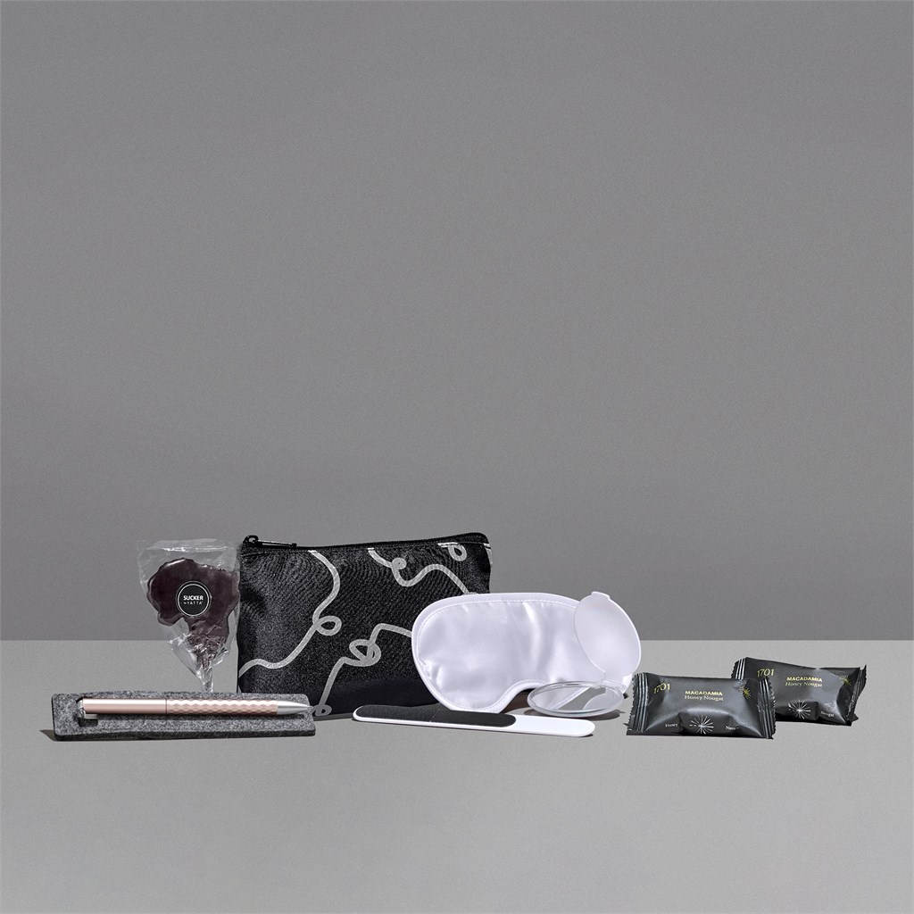 - Contains a Yatta Medium Credit Card & Coin Purse, an Aria Eye Mask, and a Grey Altitude Conte Felt Pen Pouch with an Altitude Vega Ball Pen.