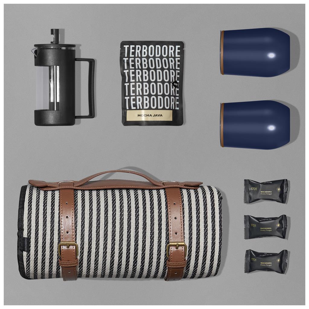 This Yatta Mocha Magic Hamper is a good gift for staff or clients. It comes in a dark grey RPET felt bag and contains a picnic blanket, coffee plunger, two double-wall tumblers, Terbadore coffee, and nougat minis. A thoughtful Yatta promotional item.