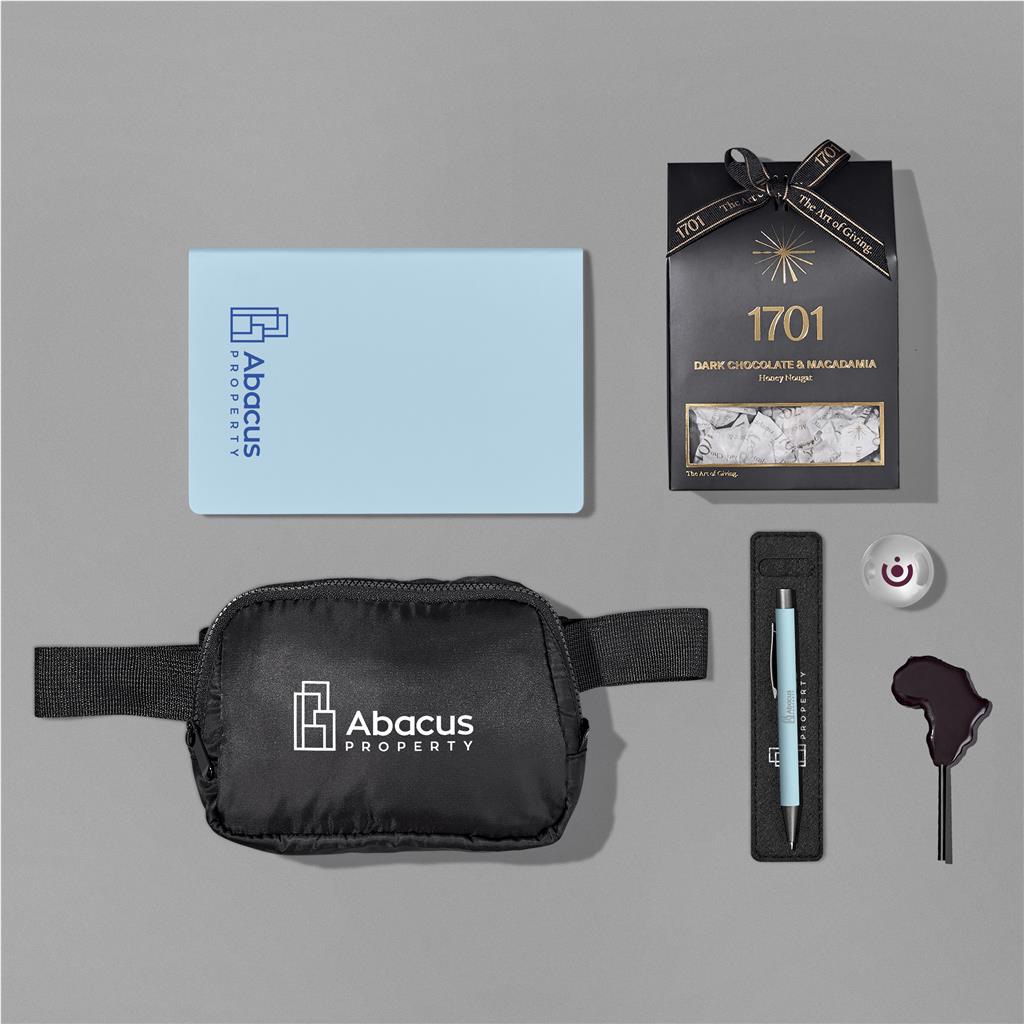 This Yatta hamper offers a refined selection of practical items. It includes an Eva & Elm Saturn Waist Bag and an Altitude A5 Soft Cover Notebook. The hamper comes in a grey gift box, tied with a distinctive YATTA ribbon, making it ideal for promotions.
